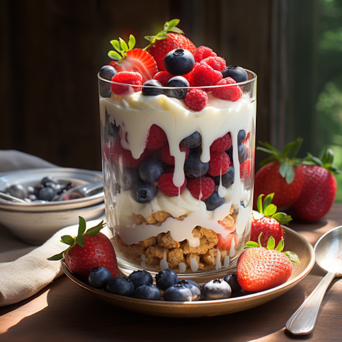 A vibrant bowl of overnight oats made with almond milk, topped with a medley of colorful fresh berries and a sprinkle of whole almonds and chia seeds, set on a rustic kitchen table with natural sunlight.
