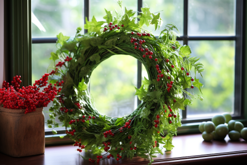 shot of fresh, green solstice wreath decorated with miniature red berries --ar 3:2 --no text brand numbering copyright --style raw