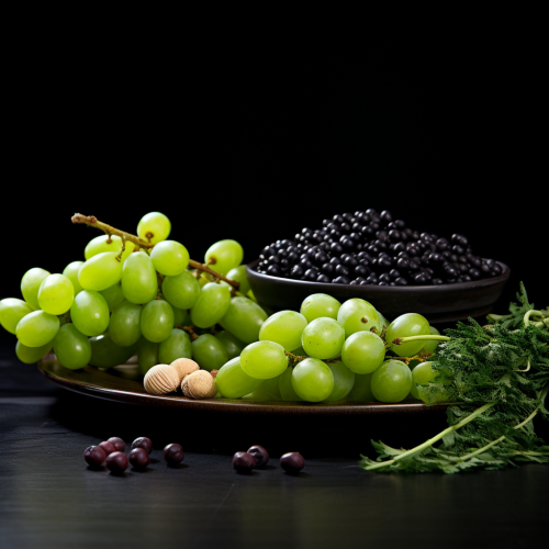 On a black table with a black background, green grape berries aligned mixed with green olives with pits