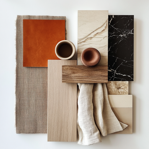 a realistic material moodboard for an interior design project, minimalistic, samples, white background, inspiration, light wood, brown leather, terracotta, black marble, beige cloth, carpet