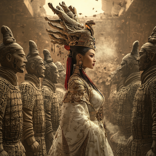 digital art of ((Cleopatra)) visiting the Terracotta Warriors, (ancient Egyptian queen), ((elaborate gold Egyptian headdress)), cobra crown, ornate Egyptian jewelry, flowing white royal dress, ((standing among terracotta warriors)), Xian warrior statues, (archaeological site), dramatic lighting, ancient Chinese architecture, historical atmosphere, (majestic scene), dust particles in air, ray of light, cinematic composition, ultra detailed, realistic rendering, 4k resolution, epic scale, ((historical crossover)), archaeological excavation site, warm color palette