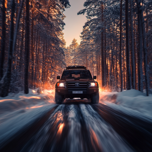 Award winning wide angle photography of a [Toyota Land Cruiser] 250 driving on a winter forest road at sunset, hyper detailed, ultra textured, cinematic lighting, dramatic lighting, natural lighting, octane rendering. Blurred Motion.