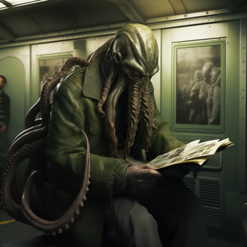 a giant phoenix fighting cthulhu in space. anxiety atmosphere, dark and pale shades, aliens monolyths, steam flowing up from hole at center --ar 9:16 --stylize 1000 --v 5.0
