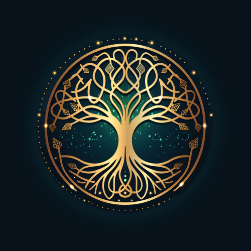 Minimalist emblem, 280x280 pixels, representing a fusion of nature, technology, and philosophy, with subtle Celtic design. A sleek, golden tree gracefully intertwined with delicate Celtic knots, its roots merging into a circuit board to symbolize the harmony between wisdom, growth, and the connection between ancient and modern worlds. The background transitions smoothly into a soft, starry night sky, capturing the cozy, contemplative atmosphere of Lofi Girl. Blue and green hues dominate the natural elements, while warm golden light accents symbolize enlightenment and knowledge. The design is characterized by soft, lofi textures with clean, minimalist lines, cozy yet profound. A subtle touch of modern anime style enhances the intricate geometric patterns, creating a serene balance between nature and technology, encapsulating the duality of the organic and digital world --s 250 --v 6.0