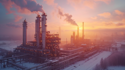 airel view, an enormous chemical plant in a snowing sunset, a Chinese dragon is flying in the sky. Beautifully Color Graded, vibrant colors, high details, highly expressive, epic and intense --ar 16:9 --stylize 250 --v 6.0 --style raw