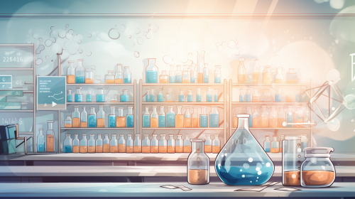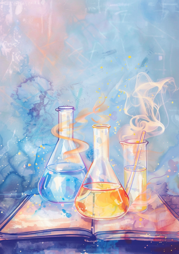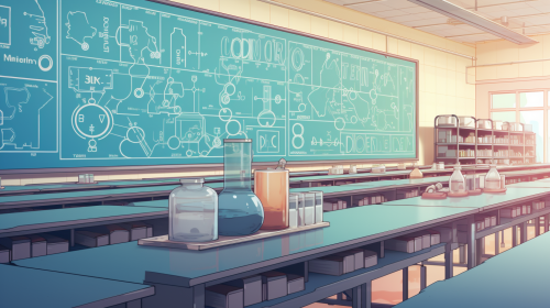 chemical class with students and teacher in high school in the style of animated illustrations text based. Bluish tinted. --style raw --stylize 150 --ar 16:9