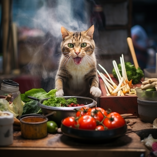 angry cat making spicy papaya salad using thai mortar, street vender, asean market, hot weather