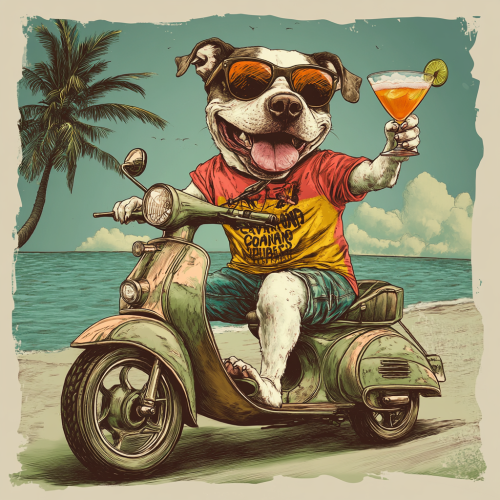 a street dog of thailand with a Chang Beer t-shirt with a margarita in a rocks glass in one hand while driving a scooter by the beach, he have cool sunny . Make it in a retro style ambiant not to graphic