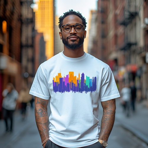 pure white t-shirt . A man wearing this t-shirt is standing on the street. In the background of his photo is an urban street scene. He is looking straight at the camera with an expression of pride. This print style uses vector graphics to create detailed illustrations for a personalized cityscape . There should be no other people or objects in front of him --style raw --s 750