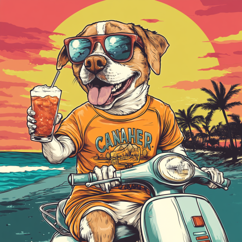 a street dog of thailand with a Chang Beer t-shirt with a cocktail in on hand while driving a scooter by the beach, he have cool sunny . Make it in a retro style ambiant not to graphic