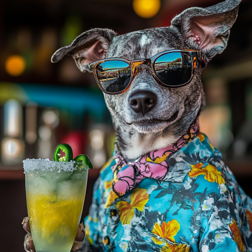 Street dog in Thailand as a bartender with a cool colourful shirt and sunglass by the beach , he have one tommy margarita in a rocks glass with an Jalapenos inside make in in a retro ambient design not to graphic