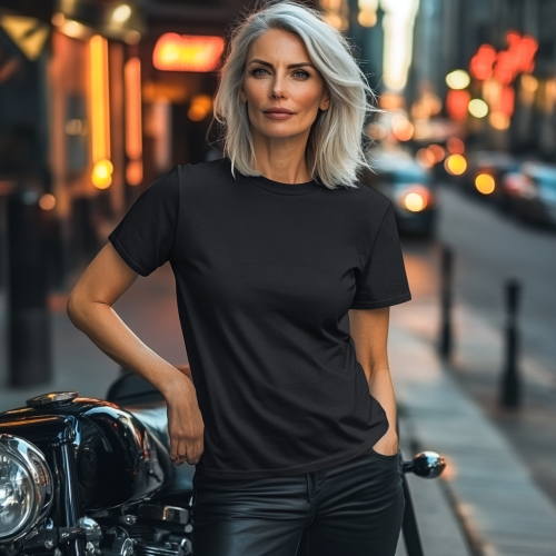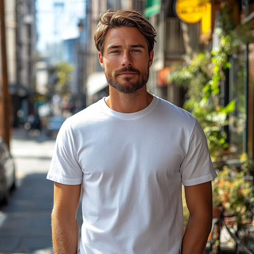 White T-shirt . no design or lettering. A man wearing this white t-shirt is standing outside. The background of his photo is an urban street scene. He is looking straight at the camera with a proud expression. This print style uses vector graphics to create detailed illustrations for a personalized cityscape . There should be no other people or objects in front of him --style raw --s 750