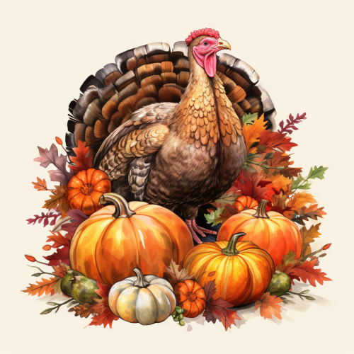 watercolor cute, baby turkey, surrounded by pumpkins, isolated on white background,