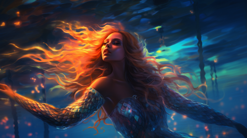 A surreal anime style oil painting of a beautiful woman with long light blonde hair and blue eyes in a mermaid dress riding on the back of a giant Arowana underwater. Trippy, neon rainbow colors, fractal patterns, high detail, iridescent, soft light.