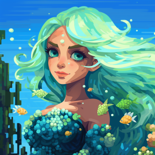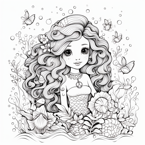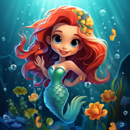 Main Element: A cute cartoon mermaid Style: Cartoonish. Expression: The mermaid should have big, bright eyes and a big smile. Colors: bright, such as under the ocean colors. Additional Details: Consider adding friendly dolphin to swim with her.