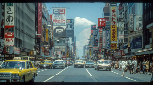 Modern city scene in Tokyo, Japan on August 01, 1972, capturing the post-war economic boom. The foreground shows busy streets filled with neon signs, taxis, and crowds of people shopping and commuting. In the background, high-rise buildings and advertisements for the upcoming Sapporo Winter Olympics are visible under a clear blue sky, symbolizing Japan’s modernization and global engagement. The lighting is bright, reflecting Tokyo’s dynamic and bustling atmosphere. --ar 16:9 --v 6.0 --style raw