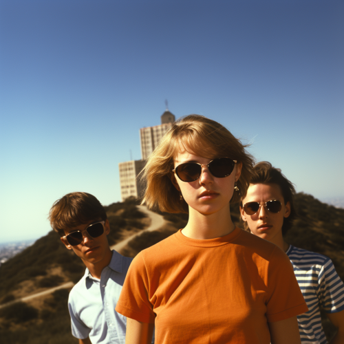 Simple Bauhaus style, three teenagers hiking in Los Angeles, big sun