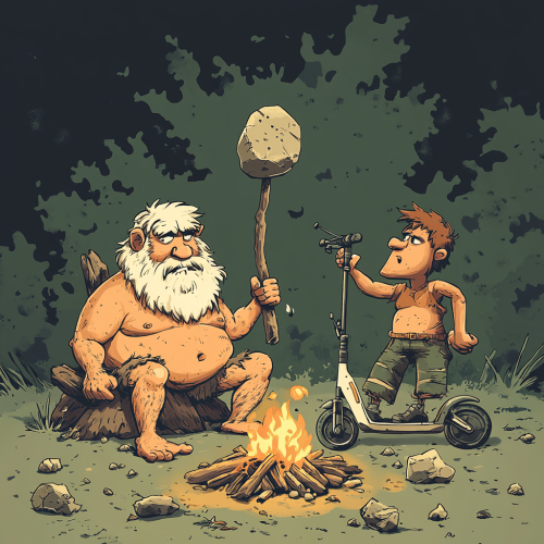 a funny meme where a caveman is sitting on the soil at a campfire, holding an wheel made of stone, while next to him, a modern human is struggling to set up an electric scooter. The caveman looks confused and a little smug. Use a playful, cartoonish style to highlight the contrast between the simple invention and the complicated modern gadget.