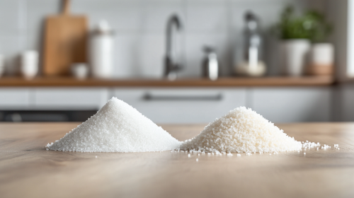 Close-up of maltodextrin and sugar side by side in a modern kitchen setting. Emphasize the difference in texture and appearance, with a focus on how maltodextrin is used as a low-calorie sugar substitute. Warm lighting and a clean, sleek background highlight the contrast and benefits of each ingredient --ar 16:9