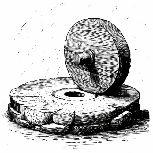a black and white woodcut style illustration of a millstone wheel used to crush grain. The wheel is made of stone and is positioned upright, with the outer edge of the wheel touching the circular stone platform. Plain white background.