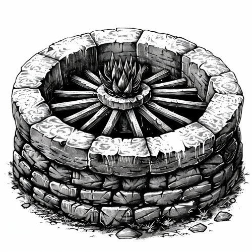 a black and white woodcut etching style illustration of a tahona wheel used for crushing agave. The wheel is made of stone and is inside of a large, round, stone platform. Plain white background.