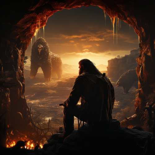 In the midst of a prehistoric landscape, a caveman stands at the entrance of a cave, silhouetted against the dimly lit interior. His rugged, primal features are accentuated by the flickering firelight within. He is draped in animal hides, clutching a crude stone tool in one hand, a symbol of human ingenuity. Outside, a world of ancient giants unfolds. Towering trees with gnarled branches stretch upward, their leaves rustling in the wind. Colossal creatures like mammoths and saber-toothed tigers roam the land, while enormous, majestic birds soar through the sky. The air is thick with the earthy scent of moss and the smoky aroma of a crackling campfire. It's a timeless scene, capturing the essence of a pivotal moment in human history, where the caveman's journey of survival and adaptation unfolds against the backdrop of a primordial world. --s 750