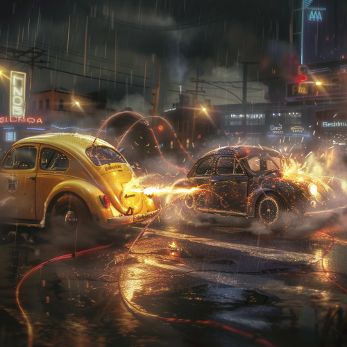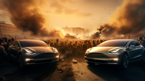 Supporters of electric cars vs. supporters of thermal cars arguing, hyperrealistic, golden hour, --ar 16:9