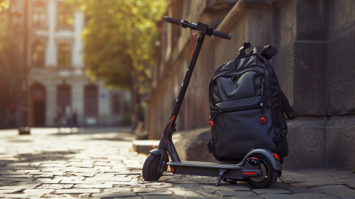 An overhead shot of the person riding an electric scooter, designed by Jony Ive and Dieter Rams in sleek grey metal with black accents, there's a pizza box on the back, captured at high speed to freeze motion, creating blurred background for focus on vehicle and rider, emphasizing modern design and performance --ar 128:85
