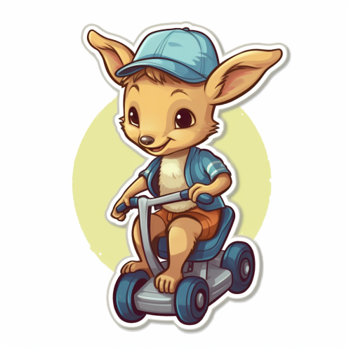 a design for a child's sticker of a kangaroo wearing safari clothes riding an electric foot scooter. --v 5.1