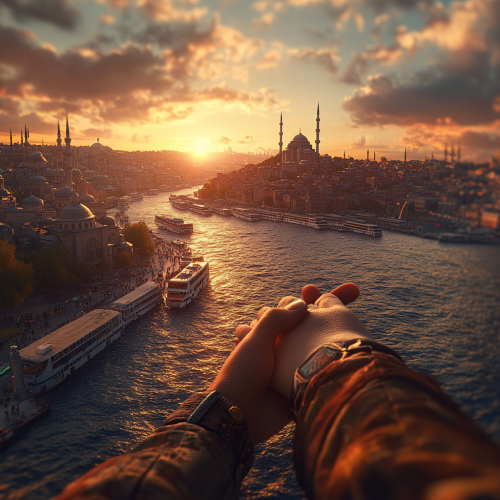 What Istanbul looks like, fascinating, 2024s, imaginative, realistic, photographic of the city of Istanbul, background Istanbul city view, incredible, creative, palace 3d render, lovers hand in hand, sunset