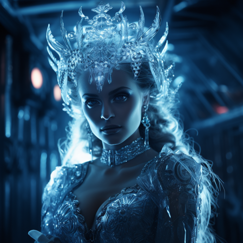 An Ice Queen in her Ice Palace in the style of neon lights, studio photography, lithograph, photo taken with provia, sharpen lens, chiaroscuro portraitures, sombre