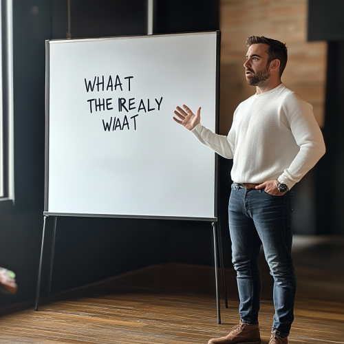 A hyper-realistic YouTube thumbnail with a person standing next to a whiteboard (3 feet wide, 2 feet tall) that has the words 'WHAT THEY REALLY WANT' written in bold, uppercase letters. The person stands confidently, gesturing towards the whiteboard, with a professional or casual background. The thumbnail is in a widescreen format (16:9), making sure both the person and the whiteboard are clearly visible and centered in the image, with good lighting and focus on the text.