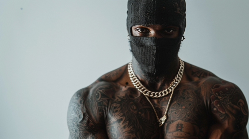 gangster with ski mask, gold chain and tattoos, Full Body Portrait in front of completely white wall --ar 16:9 --v 6.0