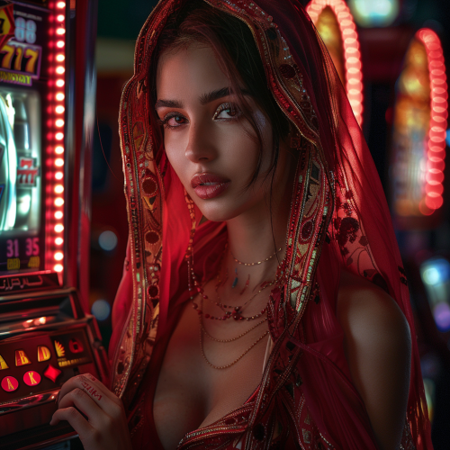 pretty hot arabic woman in red standing in front of red slotmachine 888starz brand, black background, photorealism --v 6.0 --s 250