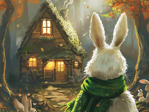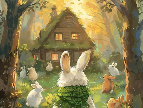 A fluffy white rabbit with soft fur, wearing a green scarf, is facing a cozy house in the forest. The rabbit's back is turned toward the viewer, as it looks toward the new home. Surrounding the rabbit are other happy woodland animals, all excited and celebrating their new house. The animals are smiling and in awe, with the cozy home standing in front of them --ar 4:3 --v 6.0