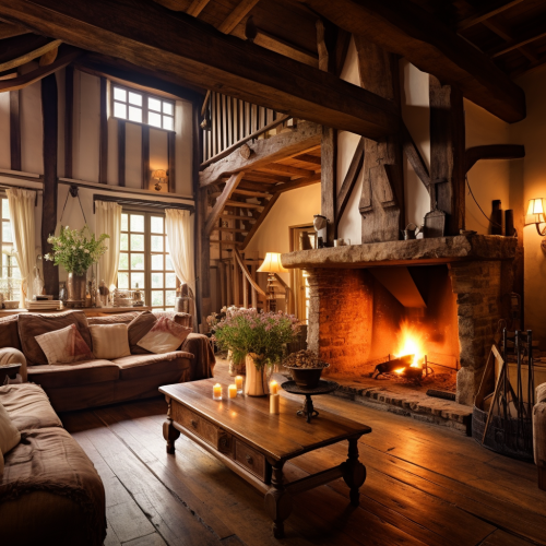 Interior of an old wooden chalet in a forest without too much furniture, natural light, sofa, table and chairs, fireplace, lamp, front door, windows, pixar style, animated drawing, 3D, top view, 4k, ar 16:9
