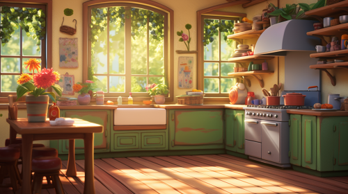 inside the kitchen, cozy house in the woods, made of woods, enchantings woods, flowers, trees, insects, majestic, nice morning light, children book illustration style,Pixar style --ar 16:9