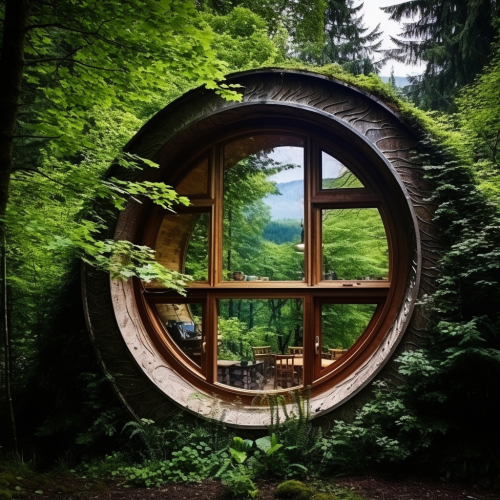 exterior of a stunning house with arched window and large windows in a the depths of the beautiful forest. The interior is adorned with light coloured stone brick walls which can be seen through the large glass panels under arch ways, creating an elegant ambiance. Captured using a Canon EOS R5 camera with a wide-angle lens, showcasing a grandeur that emphasizes the spaciousness of the exterior. --ar 128:71 --q 2 --s 750