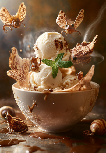 dynamic advertising image of a luscious bowl of vanilla icecream colliding with snails frogs and chocolate sauce garnished with a sprig of mint, golden hour, highly detailed, super quality --ar 100:143 --s 15 --w 2