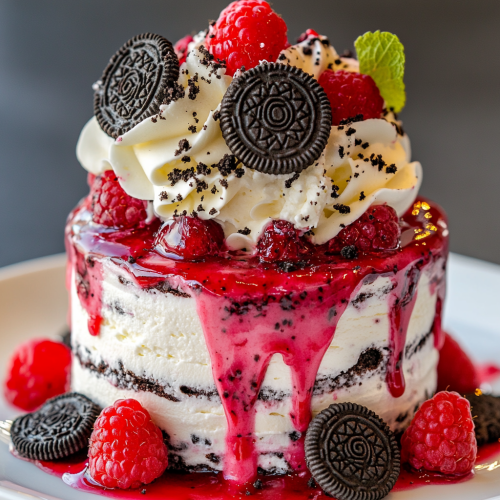 A luxurious, multi-layered cake with creamy frosting, Oreo cookie crumbles, and fresh raspberries. The cake is dripping with vibrant red raspberry sauce, creating a rich, indulgent aesthetic. Topped with swirls of whipped cream, whole raspberries, and Oreo cookies, the dessert sits on a pristine white plate with soft lighting highlighting its glossy textures. The background is minimal, drawing all attention to the detailed and colorful dessert