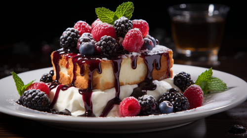 diced pandoro and alternate it with layers of whipped cream, berries and chocolate sauce, bright studio photography, white lights --ar 16:9 --s 750