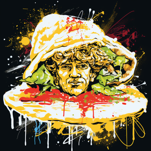 A very realistic side image of a thin frozen galette bread. This sandwich contains pieces of chicken and french fries with white sauce, so that part of the chicken pieces, french fries and white sauce fly over the sandwich in the air, with an artistic advertising design, so that smoke rises from it, and the white sauce appears in a way An advertisement. Next to this a box of french fries with ketchup sauce in an advertising manner, and next to them is a can of Coca-Cola that appears in an advertising manner.