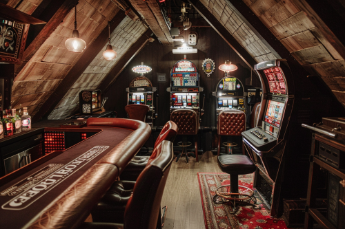 a converted industrial attic from 1920 converted into a speakeasy and gambling parlor. There's a self-serve bar just big enough to seat 4 people. There's an antique slot machine and a poker table. The space is cramped and the ceiling angled. in the style of art deco industrial. --ar 3:2
