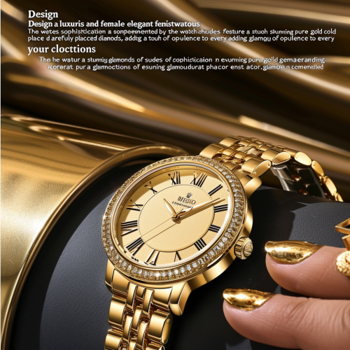 "Design a luxurious and elegant female wristwatch that exudes sophistication and glamour. The watch should feature a stunning pure gold color, exquisitely complemented by the brilliance of carefully placed diamonds, adding a touch of opulence to every glance. Consider experimenting with the interplay of colors to ensure the perfect match with the surrounding environment, particularly against a backdrop of beautiful formal settings. The watch band should be slim yet striking, embodying both grace and formality to elevate any ensemble. Capture the essence of timeless beauty and refinement in every detail of this exceptional timepiece." --v 6.0