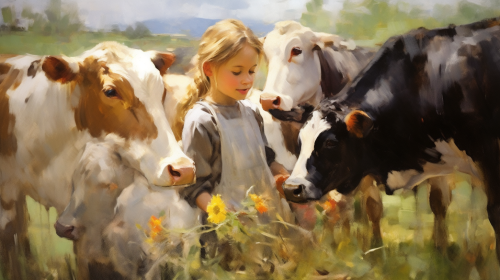une image qui montre la basse-cour d'une ferme, avec une vache, une cochon, une poule et un coq, des chèvres et des lapins. Dans un style de peinture anïve --ar 6:5 --v 6.0 --s 250