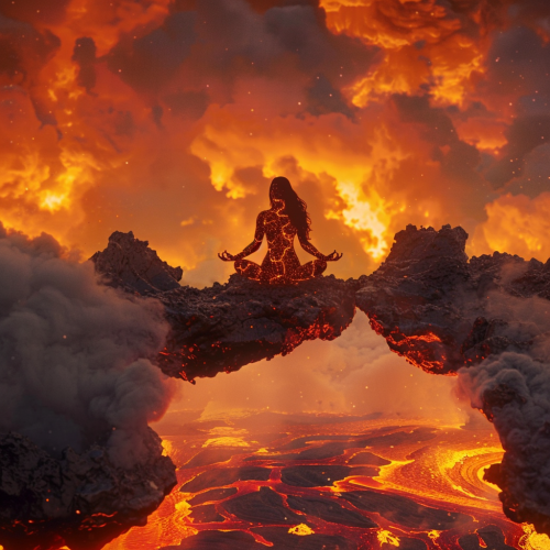 A cute chibi cat with a fiery appearance, surrounded by glowing lava. The cat’s fur has a warm, molten color palette of red, orange, and yellow, mimicking the appearance of flowing lava. It stands on a rocky surface with molten lava flowing around it, and its eyes and expression convey a playful, adventurous spirit. The background features an intense, volcanic landscape with glowing lava flows and smoke, enhancing the cat’s fiery charm 4K, HDR, highly detailed