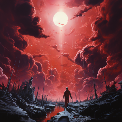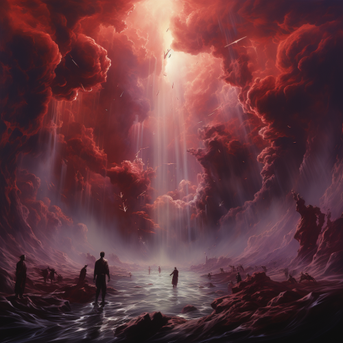 floating bodies in the rapture during the apocalypse, red, black, grey, purple --s 750