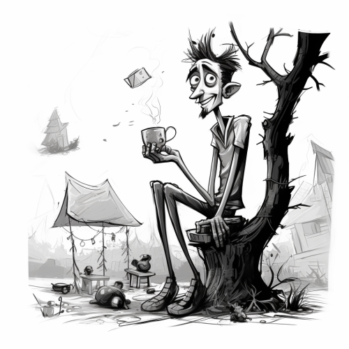 funny cartoon sketch in black and white of drunk skinny man sitting on the branch in the woods campsite