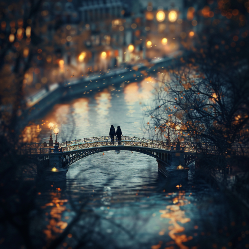 An hyperealistic and captivating image of a very illuminated bridge in a city crossing a night landscape, with two people meeting in the middle of the bridge; photo essay in the style of National Geographic, chaos, award winning, sharp focus on subjects, some motion blur, 8k –ar 16:9 – v5.1 – q 2 – s750
