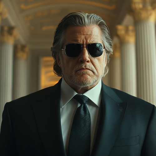 A hyper-realistic film still of Steve Bannon playing the character of Jackson Lamb wearing a suit in a spy thriller directed by James Cameron. ar 16:9